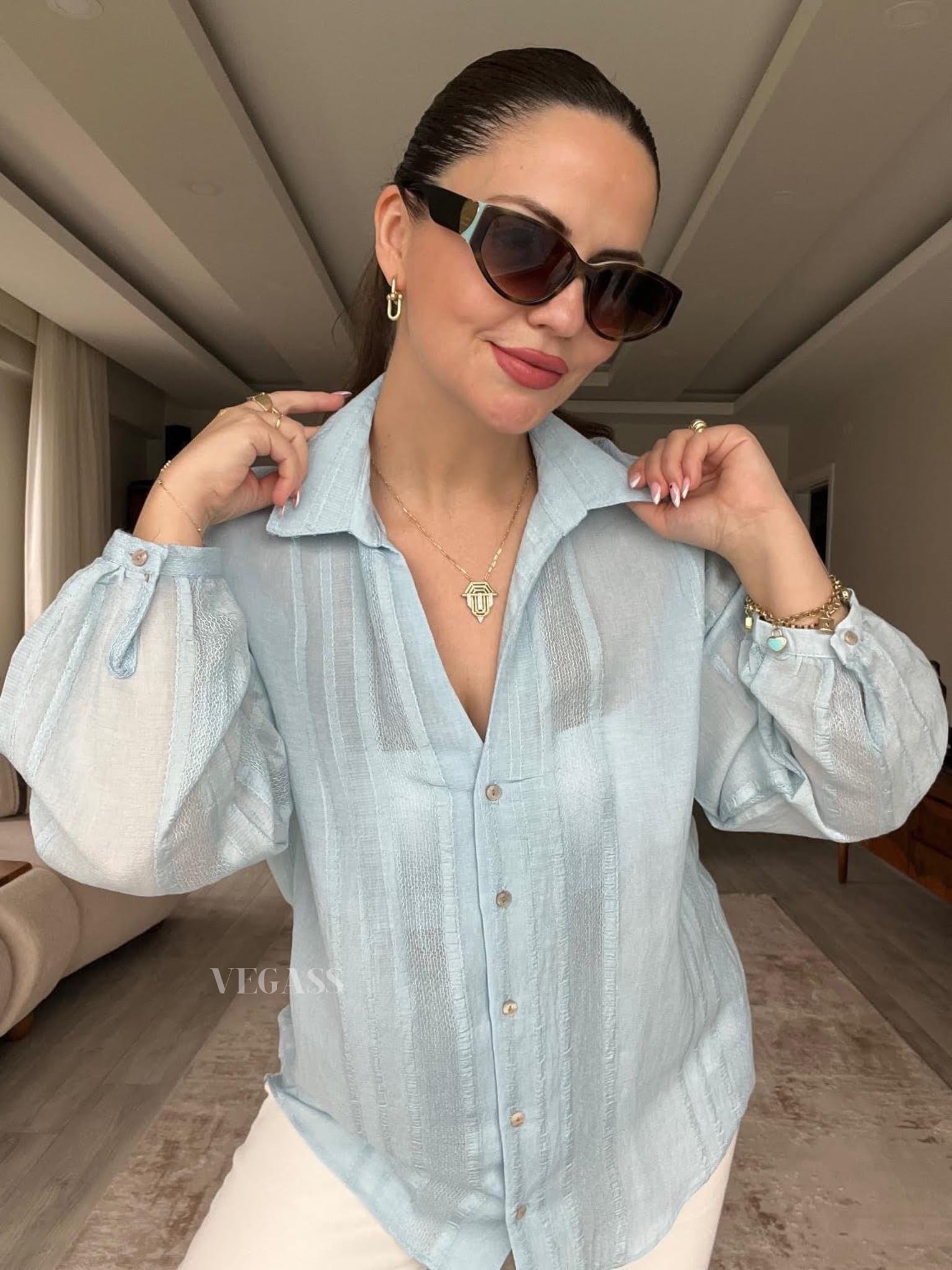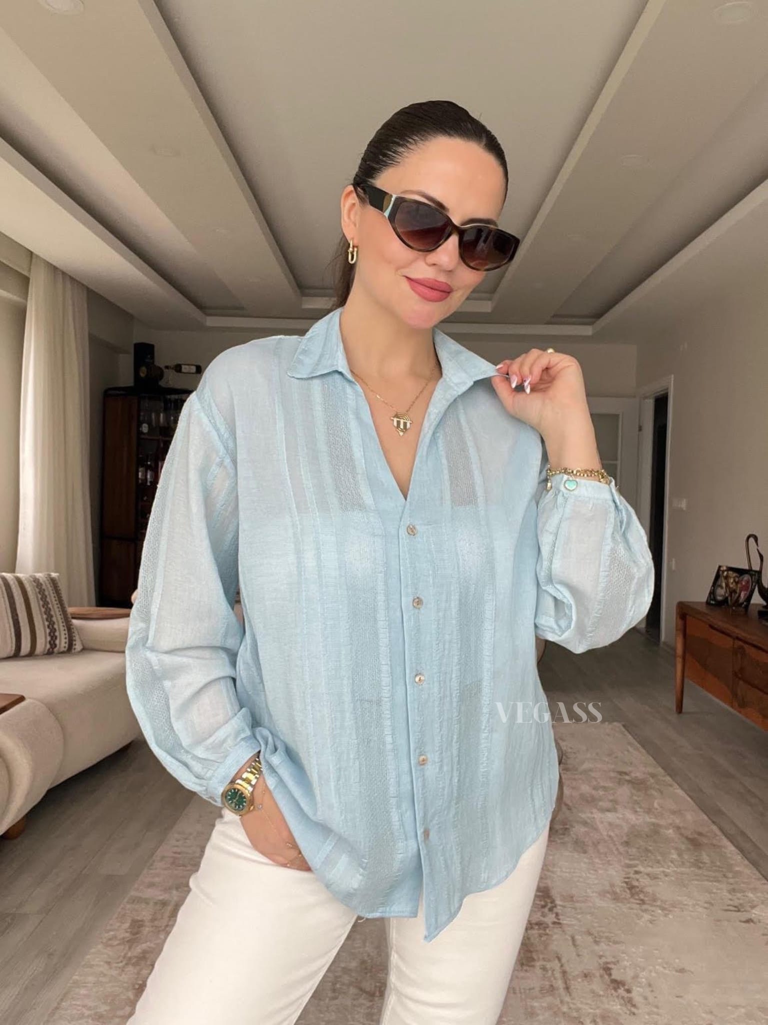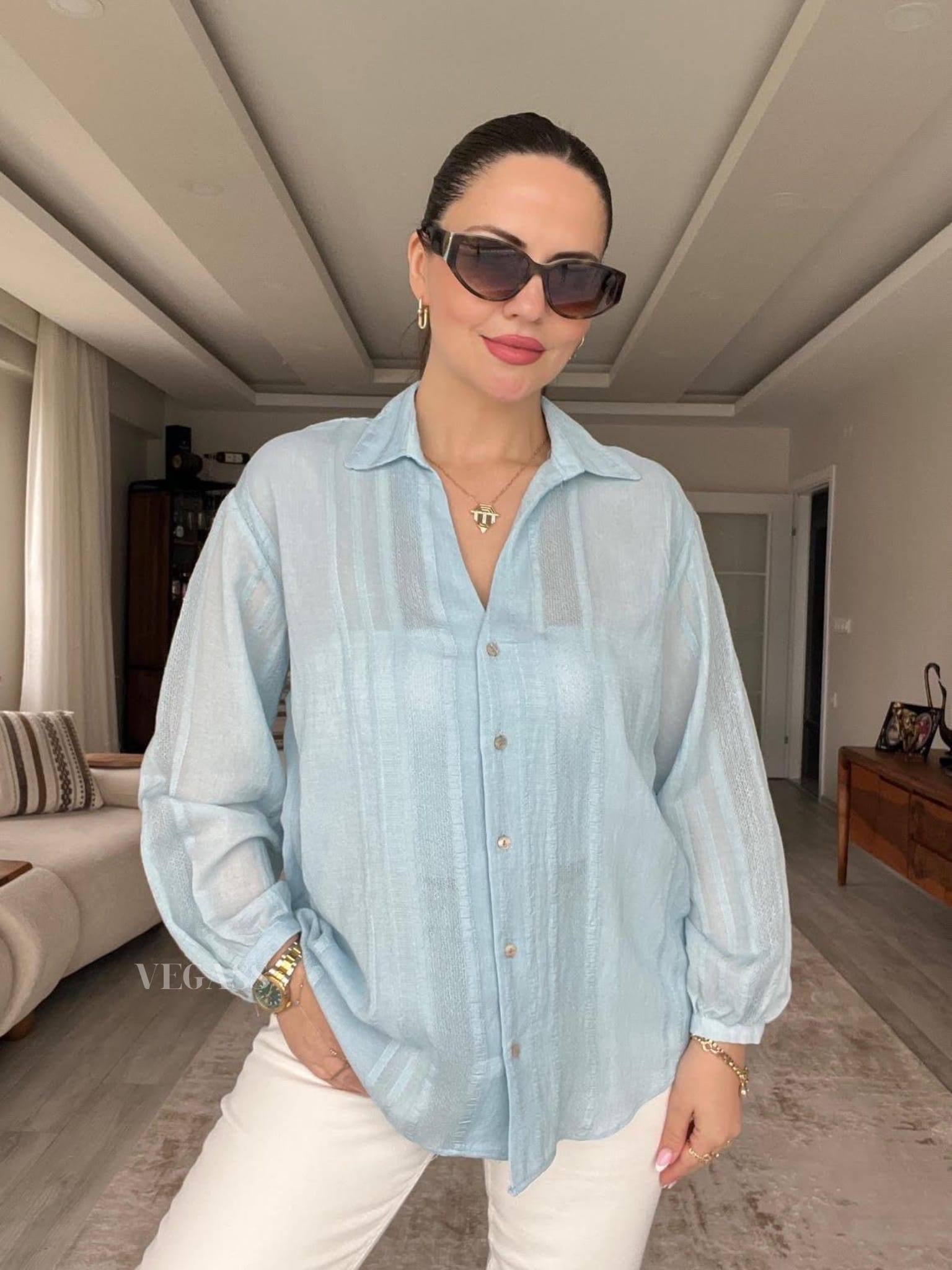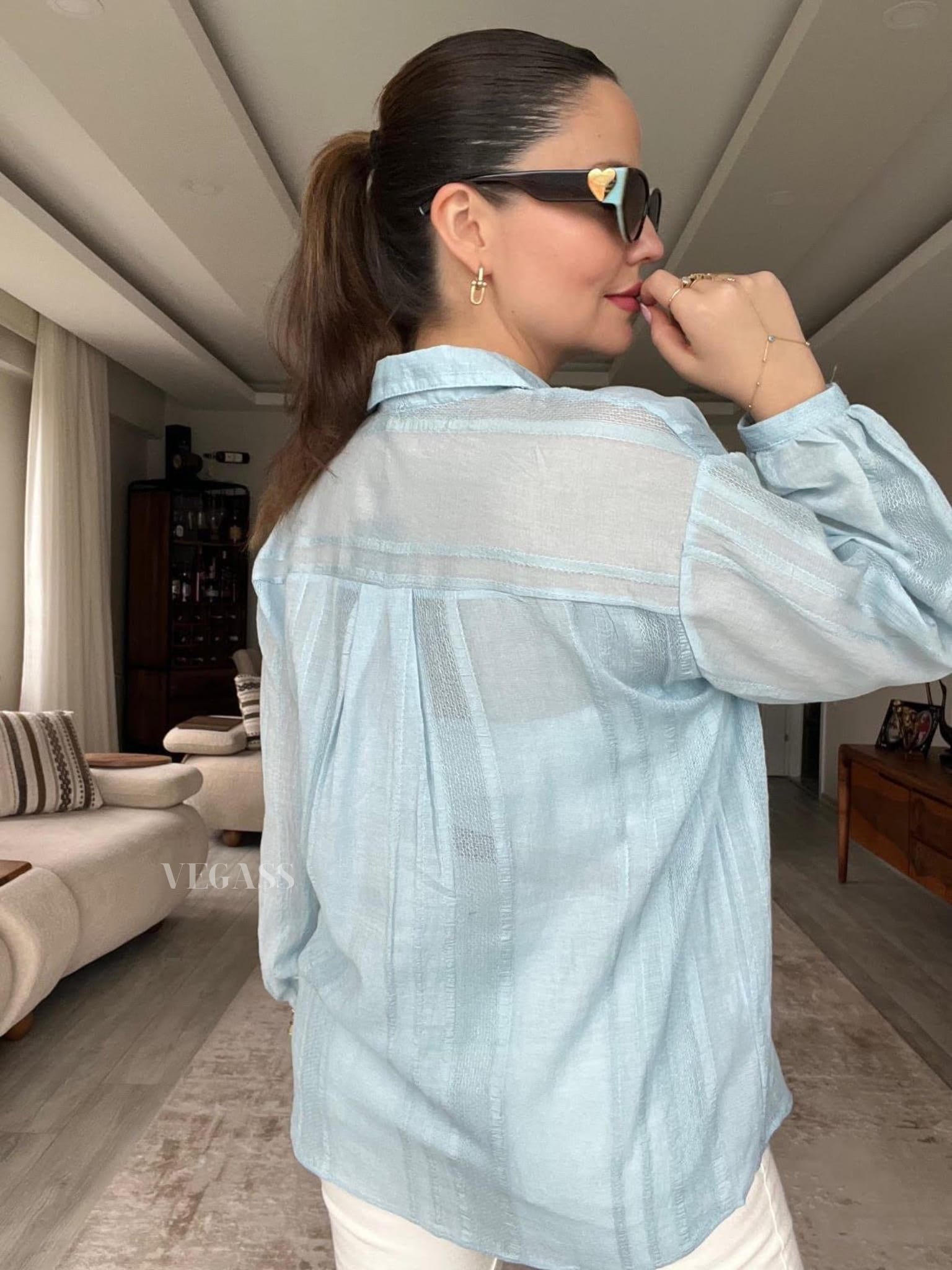 ☁️ Tissu léger effet froissé – Idéal pour un look casual chic Craquez pour cette chemise légère au charme naturel et au tissu subtilement rayé. Confectionnée dans une matière douce et respirante, elle est parfaite pour la saison estivale. Son design légèrement transparent et ses manches bouffantes apportent une touche d’élégance décontractée à vos tenues